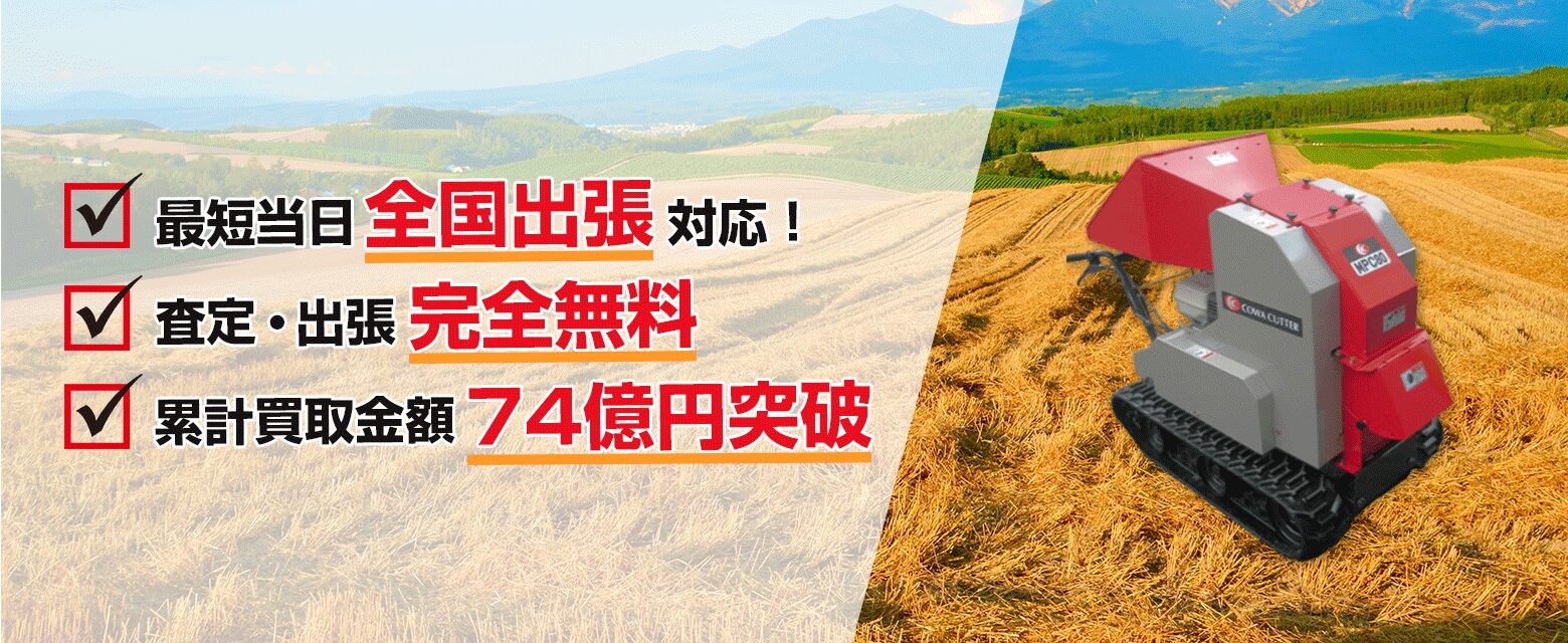 農機具王では、全国34店舗を展開し、農機具・自動計量包装機械などの買取を専門に行っています。無料の出張査定は全国対応・最短で当日も可能。もちろん出張費・査定料はすべて無料です。24時間受付のフリーダイヤルで、いつでも査定依頼を承っております。